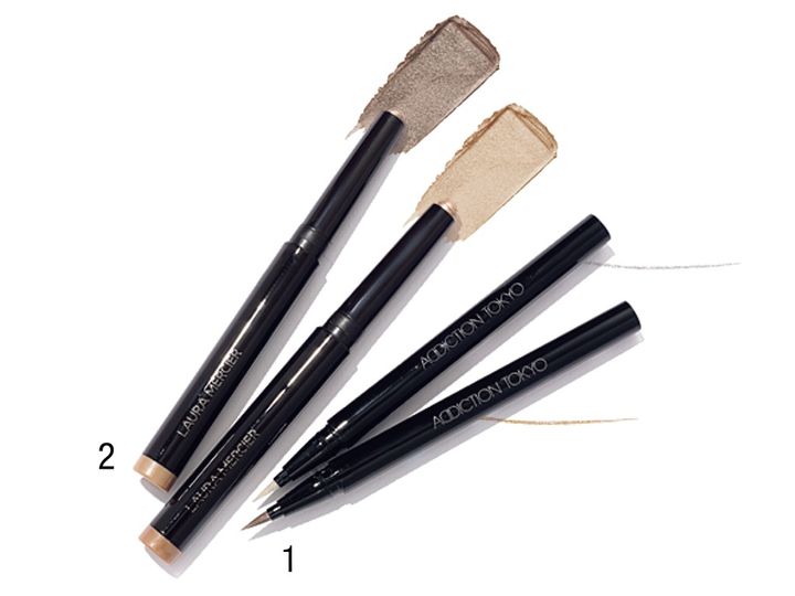 1_アディクション ザ リキッド アイライナー 〈右から〉Autumn Mirage(数量限定色)、Mariage 各3,300円/ともにアディクション ビューティ 〈右〉は儚げにきらめくパール入りのサンドベージュ。〈左〉はクリアなベースに繊細なグリッターがIN。コシのある筆で思いどおりのラインが描ける(笹本恭平さん・ヘアメイク)