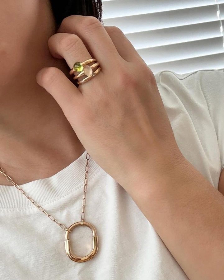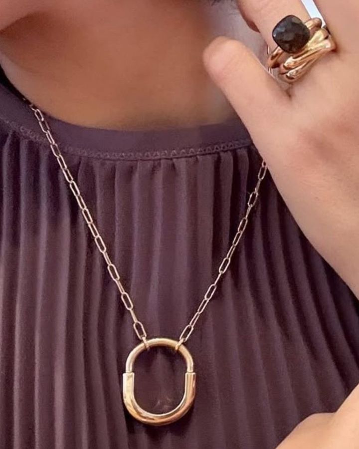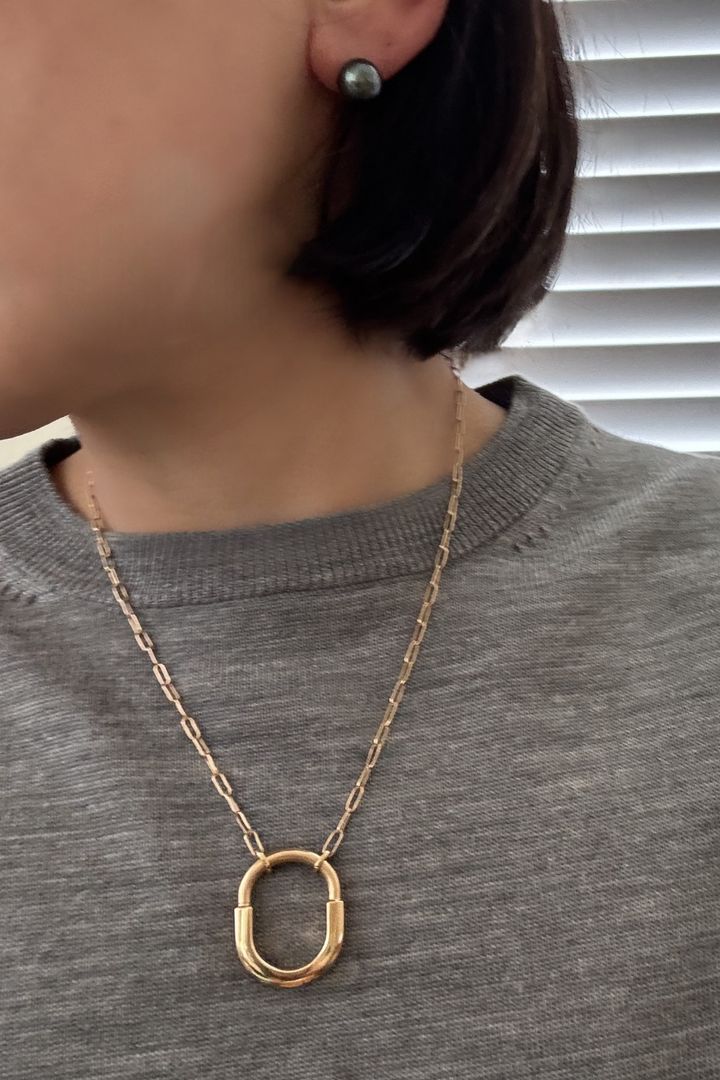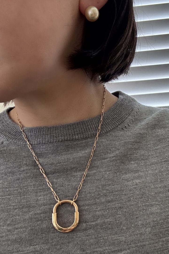 リングを購入してからしばらくして続々と新作が登場。リングもコンビ以外のものやダイヤモンドなしのデザインなども登場しましたが、初期モデルを購入するのもジュエリー好きとしてはいい思い出になるのでよしとしました。しかも購入してから1年後にはかなり値上がりしていたので、タイミング的にも最良でした。リングは楕円なのでほかとのリングとの重ねづけはせず、単品使いがメインになり、だんだんとピアスやペンダントなど、同コレクションをセット使いたい気持ちが大きくなっていきました。撮影などで何度となく実物を見ると欲しい気持ちが増大し、しばらくの期間ピアスとペンダントがウィッシュリストの上位に鎮座。そして昨年、ついにローズゴールドのミディアムサイズのペンダントを購入しました。数年前まではダイヤモンド入りのジュエリーが好きだったのですが、最近地金ジュエリーの便利さに開眼していたので、あえて地金タイプをセレクト。というのも、ここ数年増えてきた色石ジュエリーとは地金のほうが断然合わせやすいことを実感。さらに、煌めきが欲しいときは手持ちのダイヤモンドジュエリーをプラスすればいいので、私のなかで地金ジュエリーの地位がぐんと上昇していたんです。結果、ペンダントも地金だからかなり汎用性が高く、最初に購入したリングよりも活躍しているほど。リングも単品よりもペンダントを購入してからのほうが、さらに使いやすくなり、本当にいい活性剤となりました。