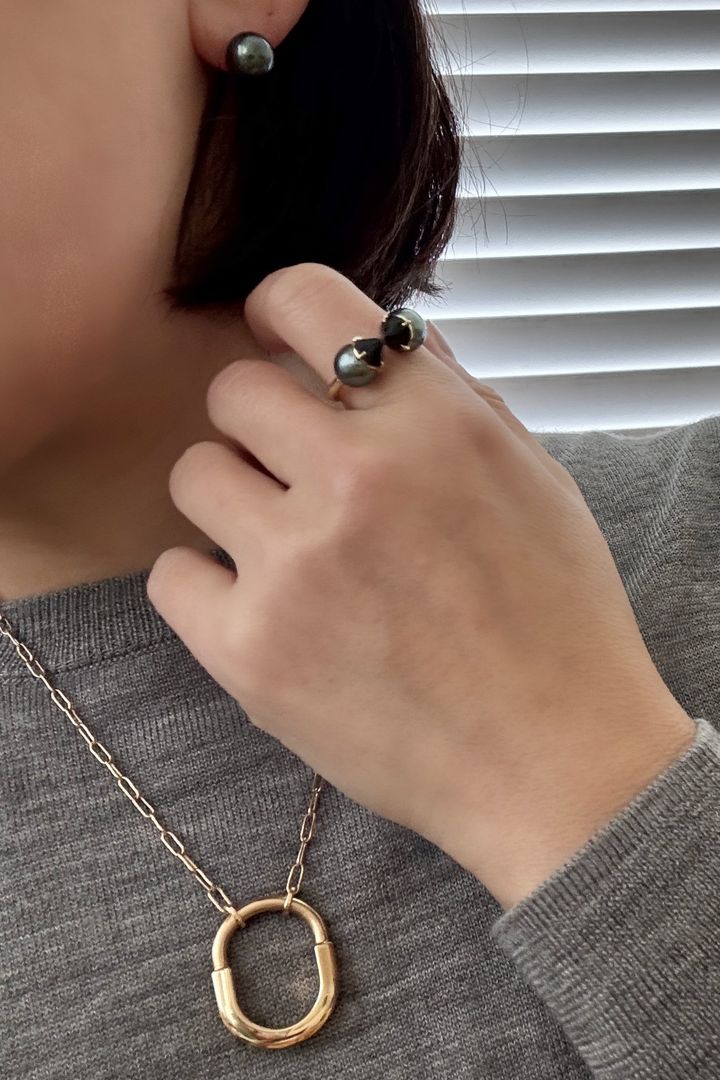 バングルのあと、バリエーション第一弾として登場したリングは、ローズゴールド×ホワイトゴールドのコンビのみでした。正直私はコンビのジュエリーを好んで集めていませんでしたが、あまりの可愛さにお迎えを即決。楕円なので着けているとくるくると回ってしまうこともありますが、それもまたこのリングの魅力。このリングを1本着けているだけで、コーディネート全体に不思議なリズムと表情を生み出してくれます。