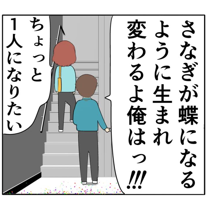 ろみ緒さんは階段を上がるめいさんの背中に向かって「さなぎが蝶になるように生まれ変わるよ俺はっ!!!」と叫びますが、めいさんは「ちょっと1人になりたい」と言って振り向きもしません。