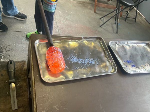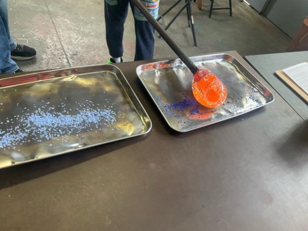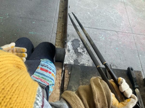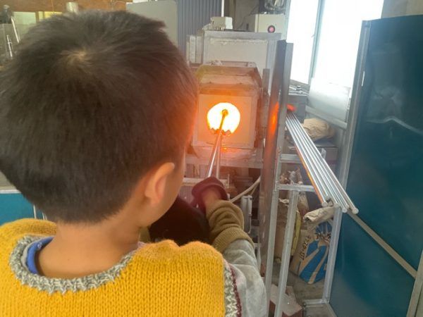 炉を近くで見て、少し緊張しているようでした。溶けたガラスは自由自在に形を変えているのを実際に見て驚いていました。