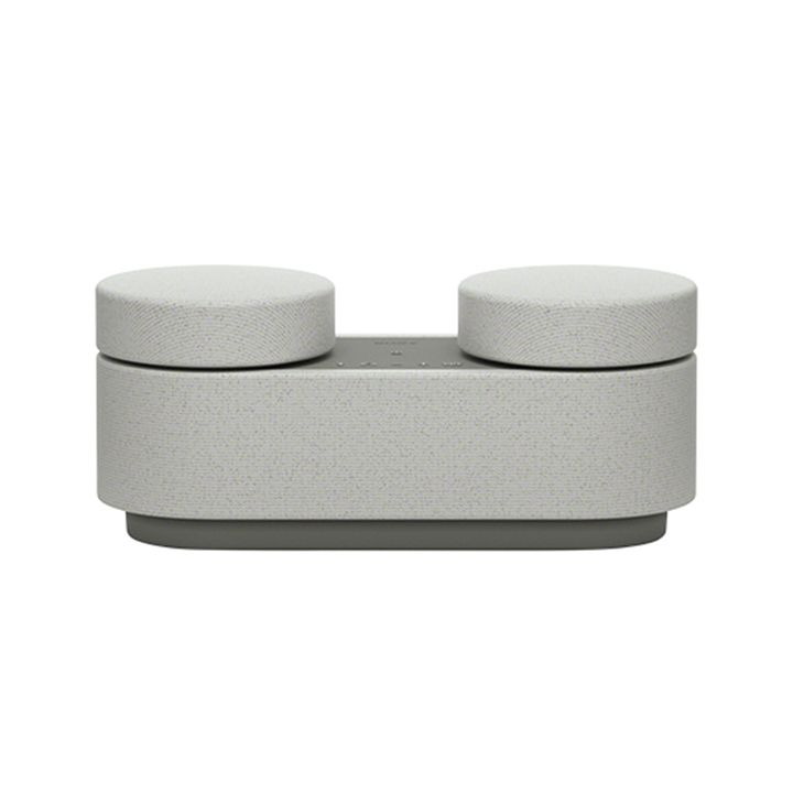 完全ワイヤレスの3in1ボディ。フロントスピーカーと、手のひらサイズの2つのスピーカーを自分の周りに置くだけで、立体音響空間が完成。「好きな場所に配置できるスピーカーなので、一人の時はサラウンドサウンドで没入し、推し活仲間がいる時は部屋全体に鳴らす、みたいな使い分けができます」(西谷さん)
