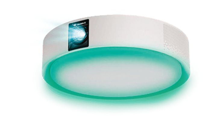 天井に設置するため、スペースの有効活用ができ、手軽に迫力の大画面を楽しめる「Aladdin X」シリーズ。新モデルは高性能、高音質の性能を継承しつつ、ライト機能がより充実。「音楽のリズムに合わせて光るミュージックのパターンや映像の色合いに合わせて光る『ムードライト』が推し活をさらに盛り上げます」(神原さん)