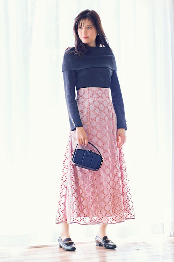 スカート¥14,960/WILLSELECTION(WILLSELECTION ルミネ有楽町店) ニット¥16,500/ジャスグリッティー ピアス¥16,500/マナ ローザ ジュエル(マナローザ) バッグ¥20,900/アドカラム(アンソロジー) 靴¥23,100/モード エ ジャコモ(オギツ)