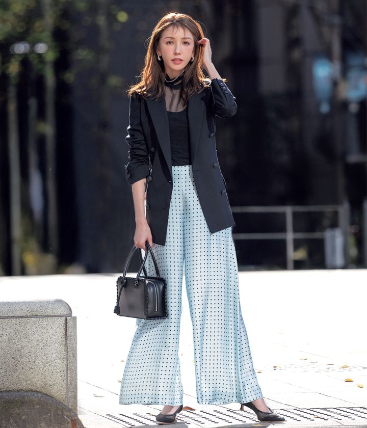 はじめましての機会が増える春。爽やかなパステルブルーで好印象に。甘さが苦手なら透けやツヤのある素材で女っぽく仕上げてみるのもアリ。軽やかなシルクのドットパンツに真面目ジャケットでキリッと締めて。透けインナーが大人の抜け感を演出。