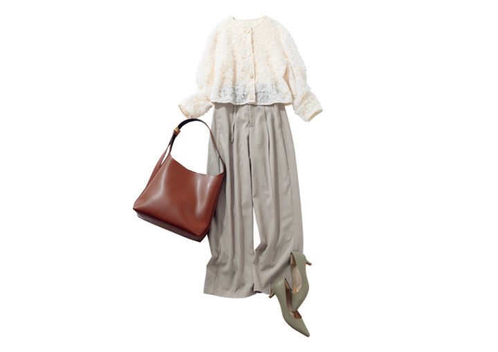 シンプルなワンドパンツと相性抜群なデコラブルゾン。シアーな生地感に加えコンパクトなシルエットなので、ONな場面にもピッタリ。アイボリーは顔色もキレイに見せてくれるので、ほんと頼れる!
