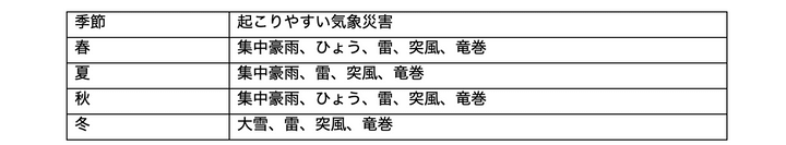 年間を通して、上空の寒気によって起こりうる気象災害として「雷」「突風」「竜巻」があります。また、春や秋はひょう、冬は大雪が発生しやすくなります。春、夏、秋はゲリラ豪雨も起こりやすくなります。