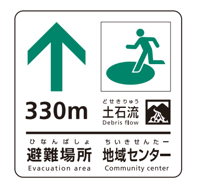 防災標識は、避難場所までの誘導を目的としたサインです。「津波の際の避難場所は〇〇公園で、ここから○○メートル」などの情報がわかります。下の例は「土石流の際の避難場所は330m先にある地域センター」だということを示しています。