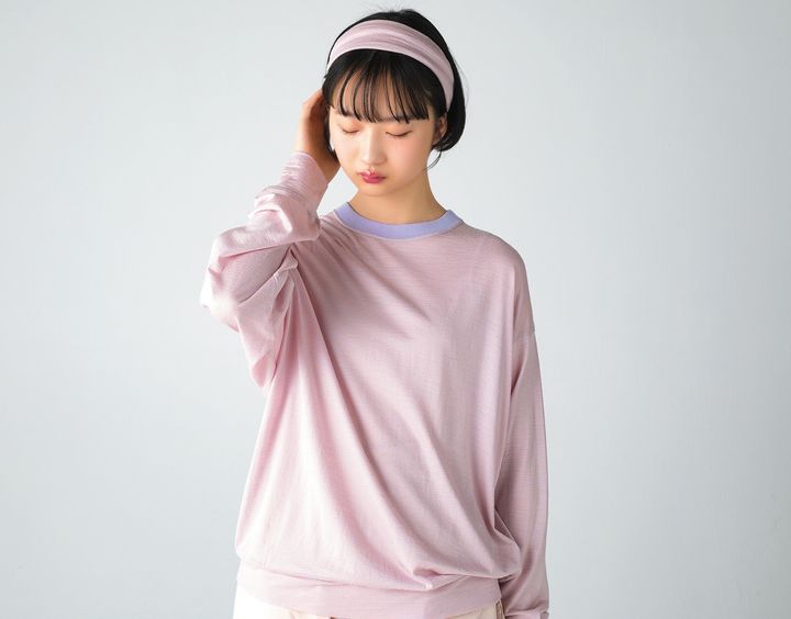 柔らかな肌触りのプルオーバーは、よく見ると細いボーダー柄。チューブはヘアバンドやネックウォーマーとしてマルチに活躍。