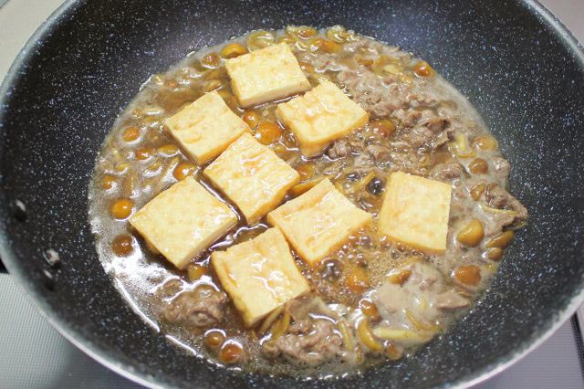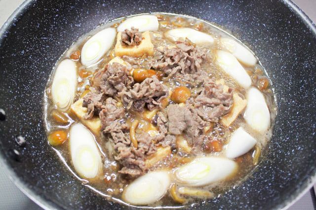 牛肉は火が通ったら硬くなるので、厚揚げの上に乗せて加熱してくださいね。筆者は長ねぎをくったりとさせたかったので、5分ほど煮込みました。