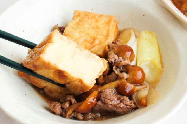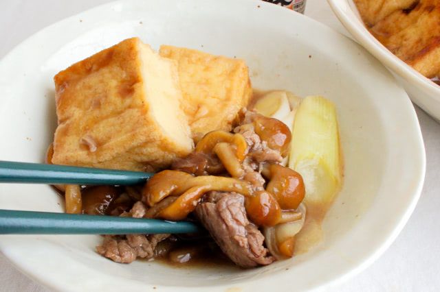 厚揚げは味が染み込みやすいので、豆腐で作る肉豆腐よりも短時間で作れます。長ねぎをやわらかくするのに煮込み時間が必要なので、厚揚げと同時に加えると、わずかですが、さらに時短で作れそうでした。
