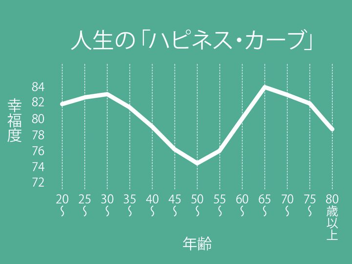 ブルッキングス研究所のシニアフェロー、ジョナサン・ラウシュの研究による「ハピネス・カーブ」。国や職種で多少異なるものの、年齢ごとの幸福度は世界共通して40代で下降し50歳頃上昇する。
