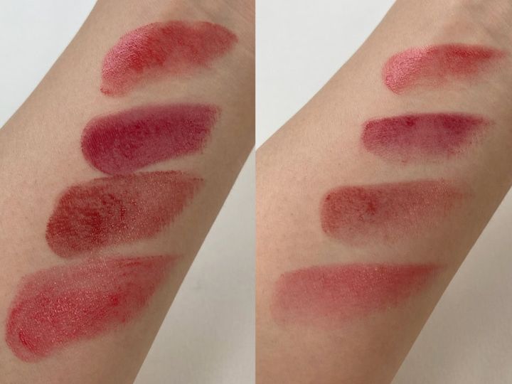 1度塗りだと透け感が際立ちます(写真右)! 3度塗りではより華やかな雰囲気に(写真左)。上から、ダリアコーラル、コスモスルビー、ブラウンローズ、ピュアスイートピー。
