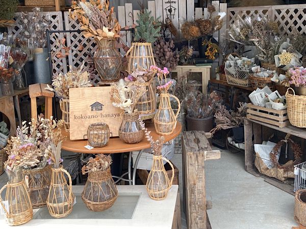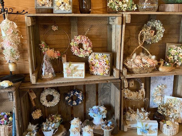 駐車場手前にはドライフラワーがたくさん並んでおり、その場で束ねていただけます!お家にある花器などを持ち込んでアレンジしていただくこともできるそうです♪ 用途、予算、デザインに合わせてのオーダーも受けていただけます。参考までに、ミニブーケのオーダー金額は1100円、ミニミニリース(直径13センチ)のオーダー金額は1870円です。お花の種類によって多少前後するそうです。気になる方はご相談してみてくださいね。
