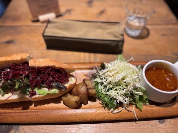サンドウィッチセットから選んだ「トルコ風サバサンド」タコスープ(ひき肉とトマトのメキシコ風)、シーザーサラダにポテトの一皿で1200円。ポテトもスープおまけ的でなくってどれも丁寧に作られた品々。サラダも色々な新鮮葉物が入っていて大満足!