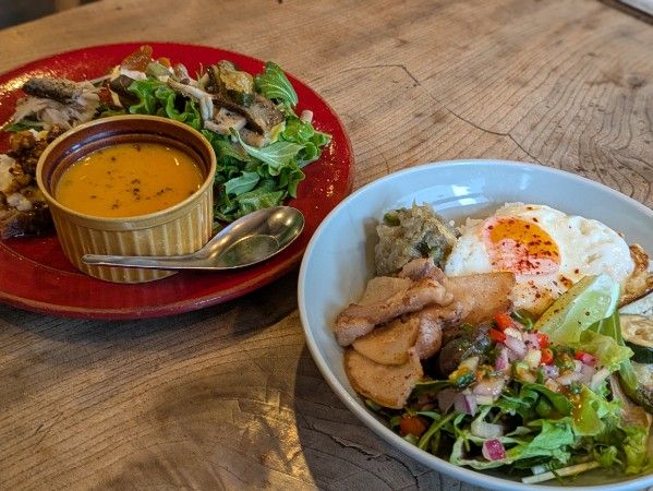 2つ目は白いお皿の「タイ風青唐辛子ディップ(ナムプリックヌム)豚バラごはんプレート」。青唐辛子を効かせたピリ辛ディップが、豚バラ肉と絶妙に合いそうですね。アイデアと工夫が詰まったメニューに、興味深々です!