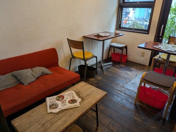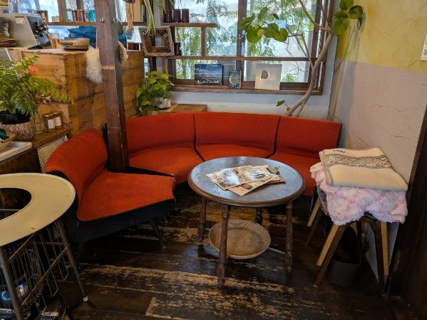店内に入ると、木の温もりを感じるレトロな家具や、インテリアが並び、温かみを感じます。席数は約30席。一人でゆっくり過ごせるカウンター席やテーブル席、さらにソファー席もあります。カラフルでありながら、調和しているほっとする空間。