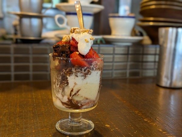 特に気になったのが、「自家製ショコラグラノーラといちごパフェ」。フレッシュないちご、自家製のイチゴソース、ショコラグラノーラ、ヨーグルト、アイス、手作りのチョコレートソースなど、こだわりの素材がぎっしり。さらに、バルサミコ酢も入っているそう。これは頼まずにはいられない!ランチの後にデザートまでしっかり楽しみました♪
