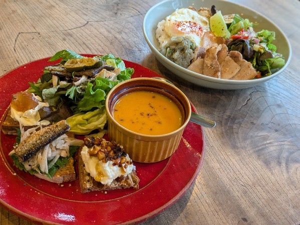 お店に伺った時、ちょうど春の限定メニューの試作をされていました。内容に多少変更があるかもしれませんが、記事が公開されるころには登場しているはず。今回はその試作品を、2品ご紹介します! 1つ目は赤いお皿の「3種のオープンサンドとスープ&サラダプレート」。自家製ナッツラー油、オイルサーディン、自家製ジャムなどがのった、3つの味が楽しめる贅沢なパンのメニュー。