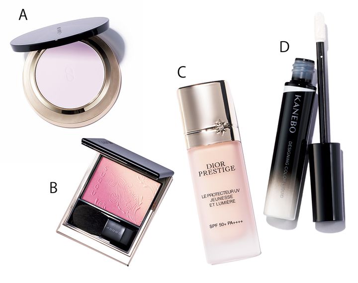 A. ソフト マット セッティングパウダー¥8,800〈セット価格〉 B.ブラーリング カラーブラッシュ 107 ¥6,600 ※限定発売(ともにSUQQU)C.プレステージ ホワイト ル プロテクターUV ルミエール BB 00 SPF50+PA++++ ¥15,950※2/21発売(パルファン・クリスチャン・ディオール)D.カネボウ デザイニングカラーリクイド 05 SPF4・PA+¥3,300(カネボウインターナショナルDiv.)