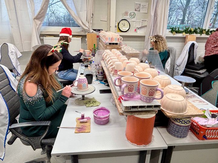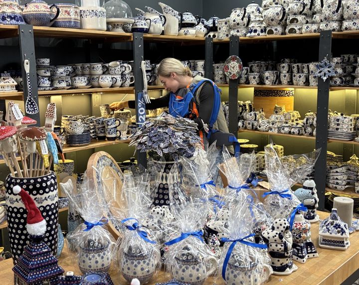 クリーム色と鮮やかな青色で彩られた素朴な陶器で、多くは女性の絵付師さんの繊細な手の動きから生み出されるデザインは温かみがあります。70ズウォティで絵付けの体験をすることも可能です。