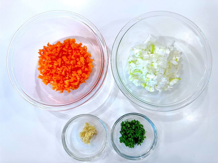 残った端のにんじん、パセリ、長ねぎはみじん切りに、しょうがはすりおろしておく。