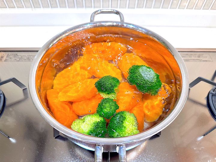 にんじんはスプーンでくり抜ける程度に、ブロッコリーはお好みの固さになるまで茹でましょう!