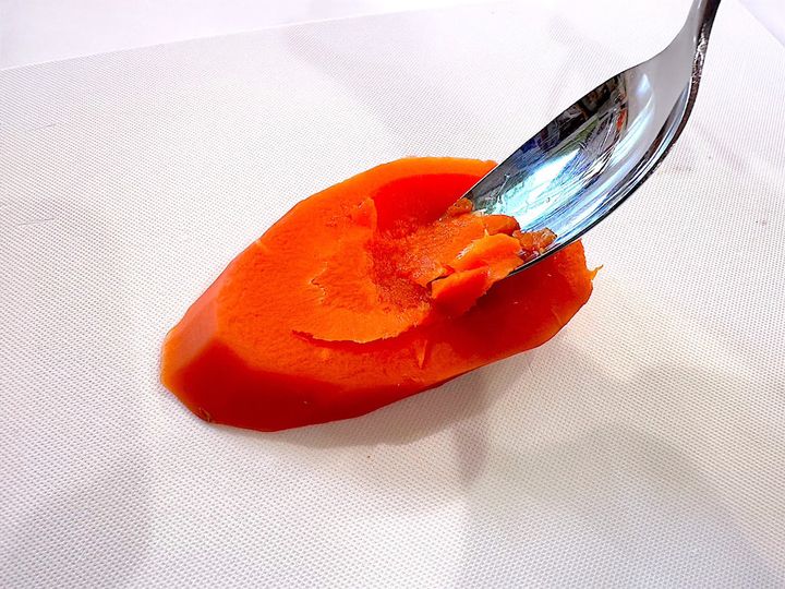 3. ざるに広げて冷まし、にんじんがお皿の形になるようスプーンでくり抜く。