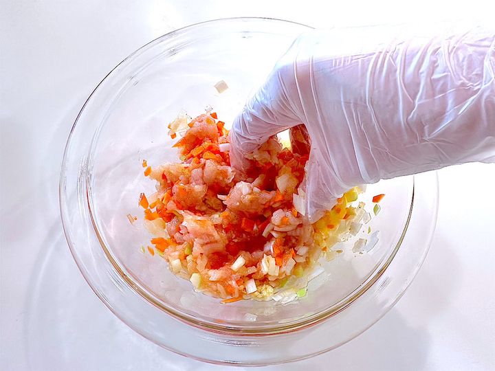 4. [A]とみじん切りにしたにんじんをボウルに入れ、粘りが出るまで混ぜ合わせる。