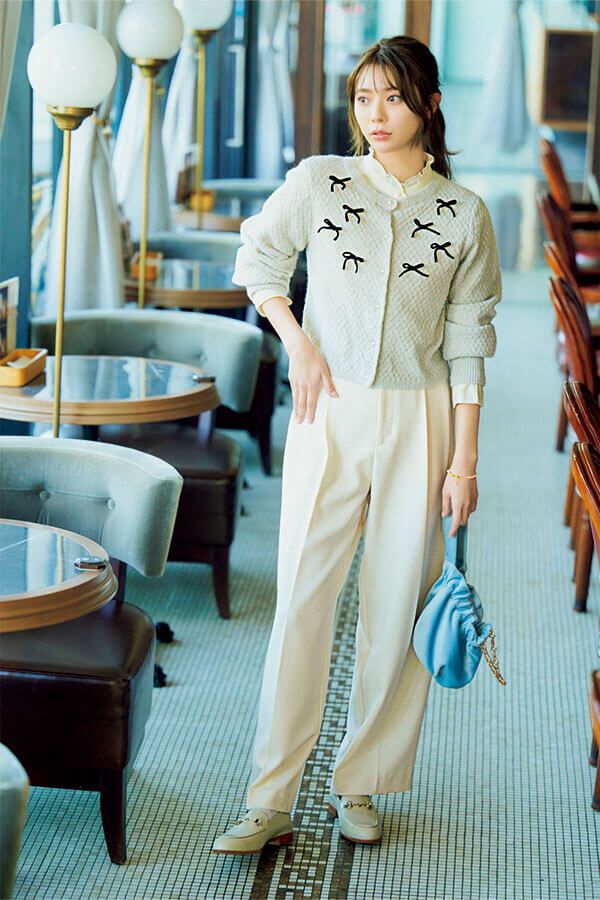 パンツ¥5,929、バッグ¥5,929/ともにVIS カーディガン¥8,800/MISCH MASCH 中に着たブラウス¥2,990/UNIQLO ブレスレット¥16,500/プラス ヴァンドーム ソックス¥880/ドット フクスケ(福助) 靴¥25,300/卑弥呼