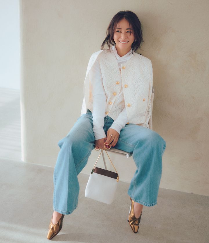 40代後半はカジュアルにまとめすぎないのがデニムコーデの鉄則。ワイドな薄色デニムを清楚なレースのジレ&ジャケットで春らしく、柔和に仕上げて。ボタンに合わせたゴールドの小物使いでリッチな表情をプラス。