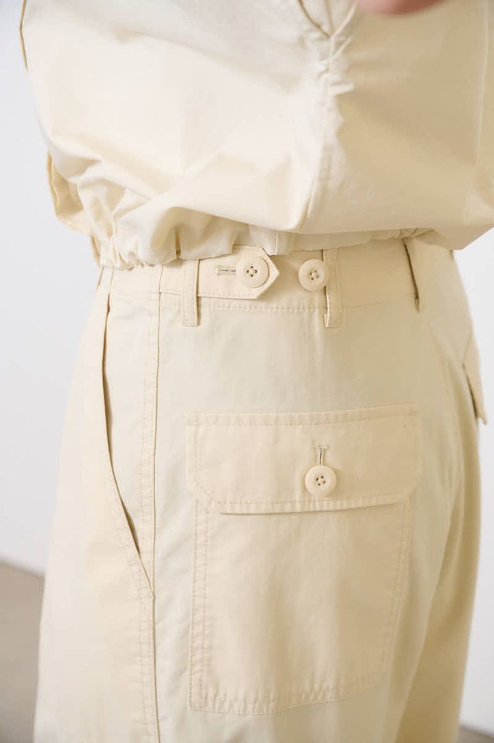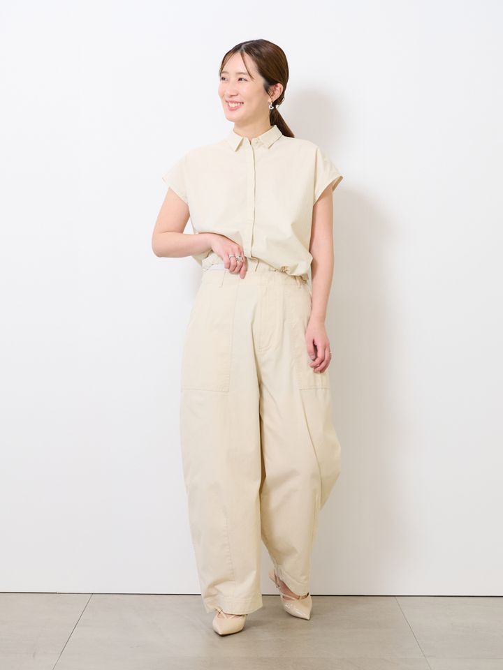 「ワイドシルエットながらも、裾に向かって緩やかに細くなるバルーンシルエット。腰回りをカバーしつつもコンパクトに見えるように最小限に膨らみを抑えたデザインだから、産後のぽっこりお腹やお尻周りも気になりません。カジュアルさを払拭できる優しげなアイボリーカラーなら、甘派ママも取り入れやすいはず。同素材のシャツとセットアップ風に着るのもおすすめです」