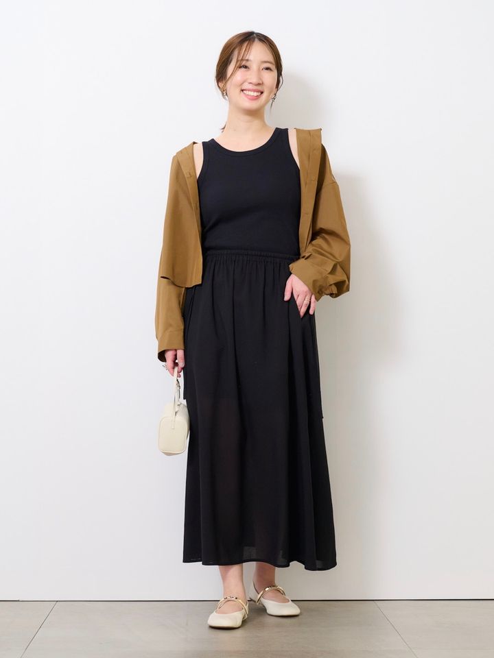 メッシュギャザーロングスリットスカート¥5,990クロップドシャツ長袖¥2,990(ともにユニクロ:シー/ユニクロ)リブブラトップ/アメリカンスリーブ¥2,290(ユニクロ)その他・私物
