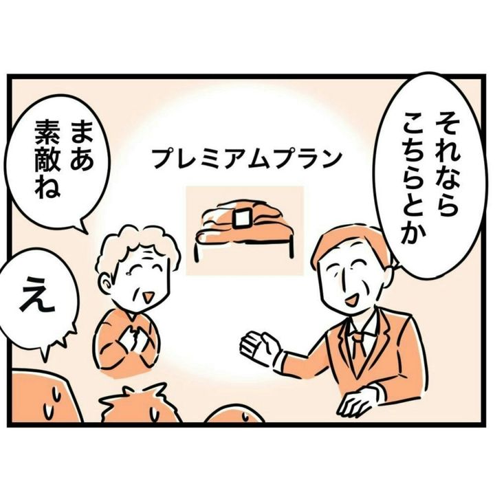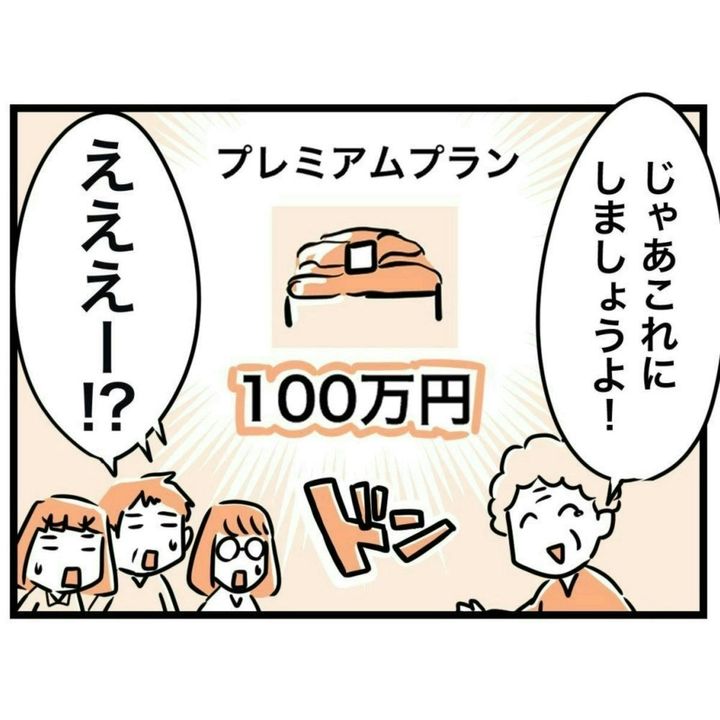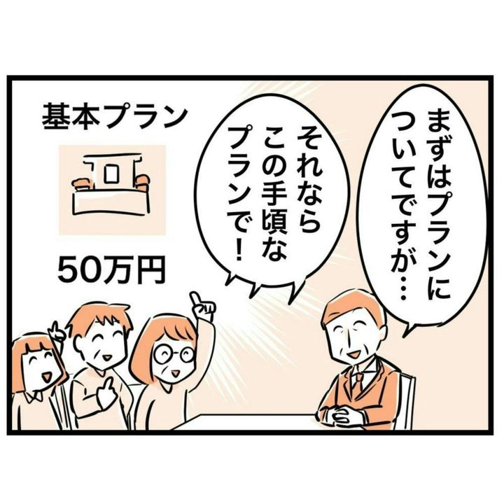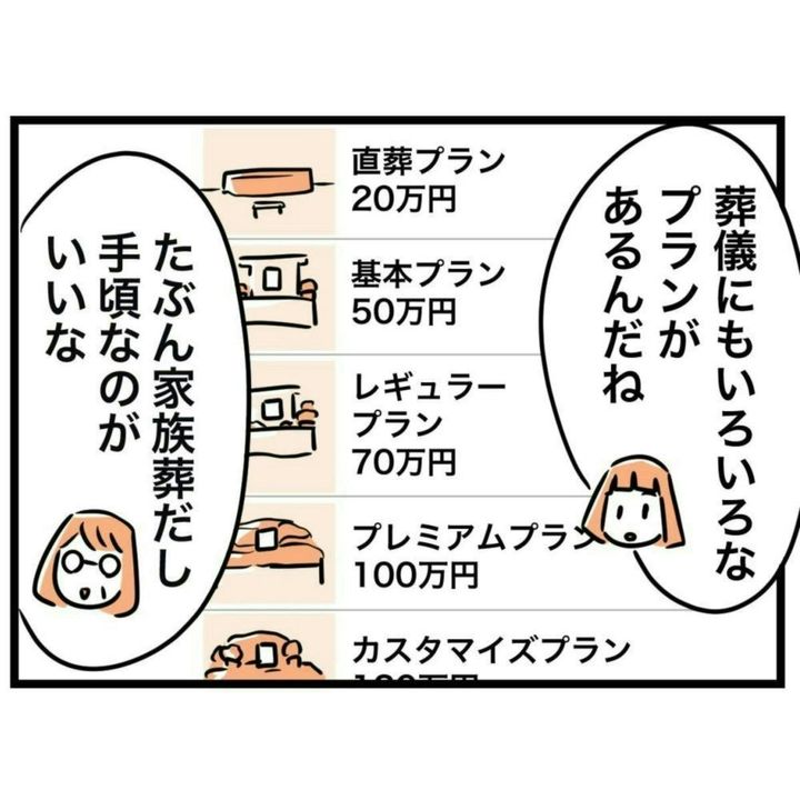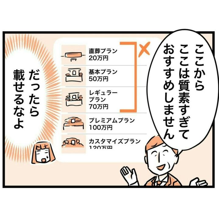 カゲワサビさん家族は、「家族葬だから」と思い、基本プランを利用しようと考えていました。ところが、打ち合わせの最中「あまり質素だとかわいそう」と言い出した祖母…。祖父を亡くしたばかりの祖母に対し、誰も強く言うことができず、「100万円のプレミアムプラン」で葬儀をすることとなりました。