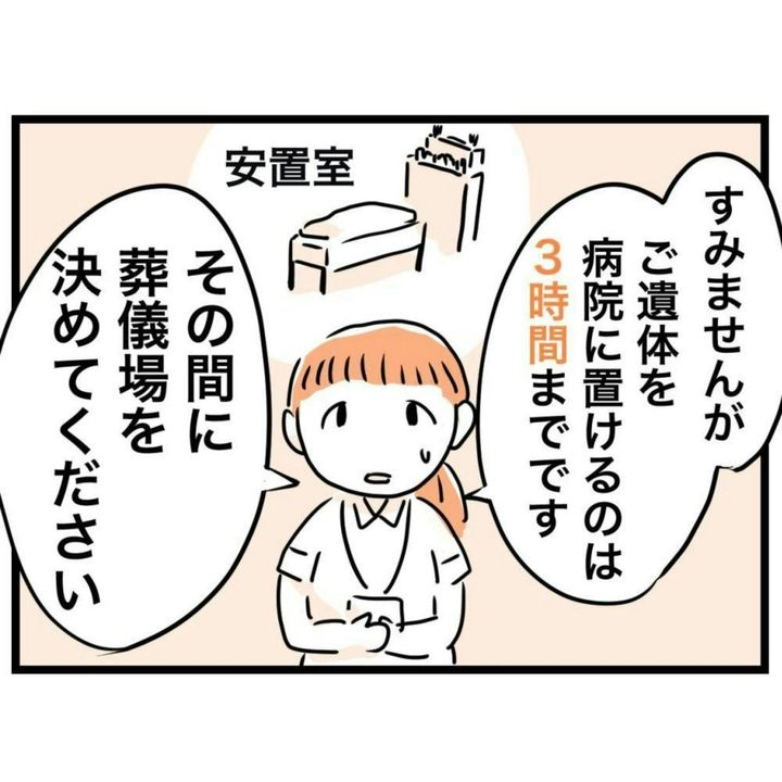 祖父が亡くなり悲しみに暮れる中、病院から「3時間の間に葬儀場を決めてください」と告げられた、カゲワサビさん家族…。この病院では、「遺体を病院で置いておけるのは3時間まで」という決まりがあるようです。
