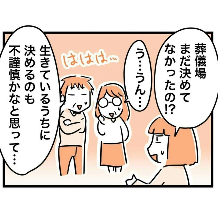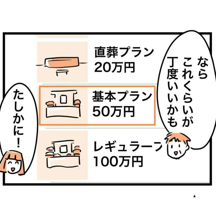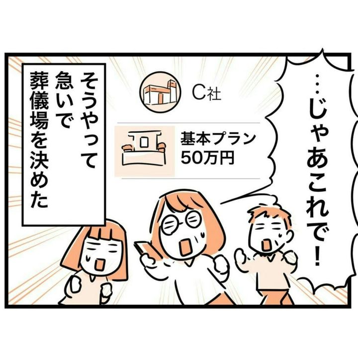 今回、葬儀社に見積もりをもらっていなかったため、他社と比較せずに決めてしまったカゲワサビさん一家。さらに、家族内でも、意見のすり合わせができていなかったため、祖母の意見で高額なプランを選んでしまいます。最期のお別れをきちんとできるよう、事前準備の大切さが伝わってくる作品です。