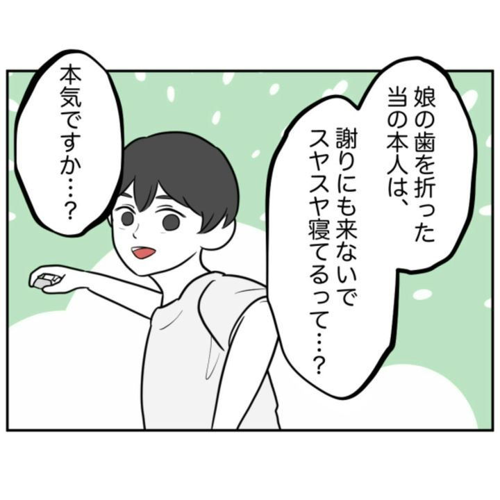 しかも、加害者の男の子は謝ろうともしません。その夜、加害者の保護者がほや助さん宅に謝罪に訪れます。ですが、ケガをさせた本人の姿は見当たりません。「夜20時には寝る健康的な生活を送っているため、連れてこなかった」と言われます…。