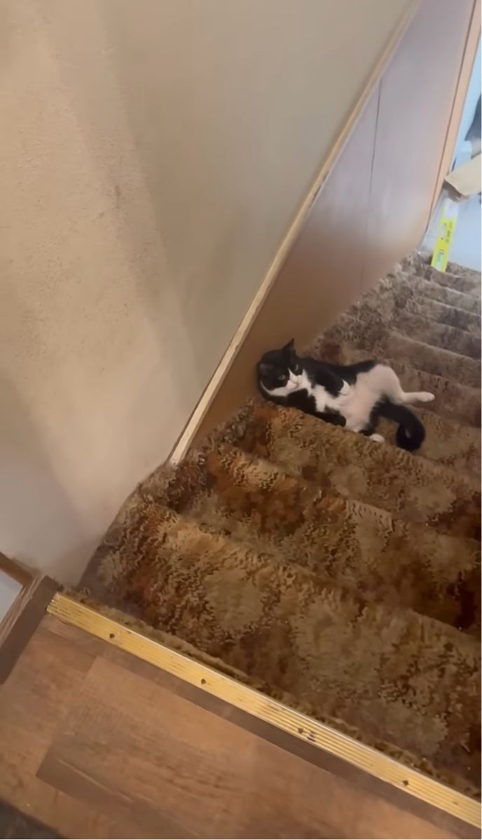 階段を降りようとすると、階段の途中でのんびりとくつろいでいる愛猫『バンディット』と目が合いました。 もっと快適な場所がありそうなものですが、この子はここでチルタイムを満喫しているようです。
