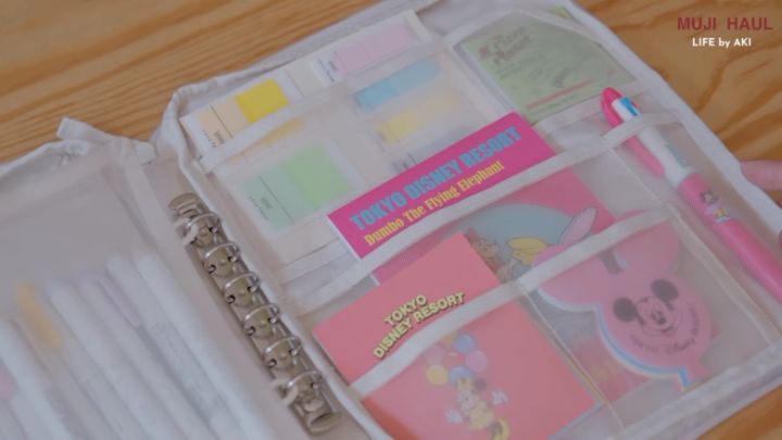 右側には6つのポケットがあり、付箋やメモ帳、ボールペンなど細々したものを分けて収納できます。表面のクリアポケットには推しの写真やポストカードをいつでも入れ替えられるので、シンプルなデザインでも飽きずに使えますよ♪