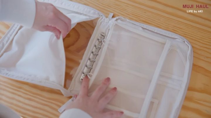 ファスナーを開けると、左手前側にはA5サイズが入る大きなポケットが。表側は、ポストカードや写真などを入れてアレンジできるクリアポケットになっています。