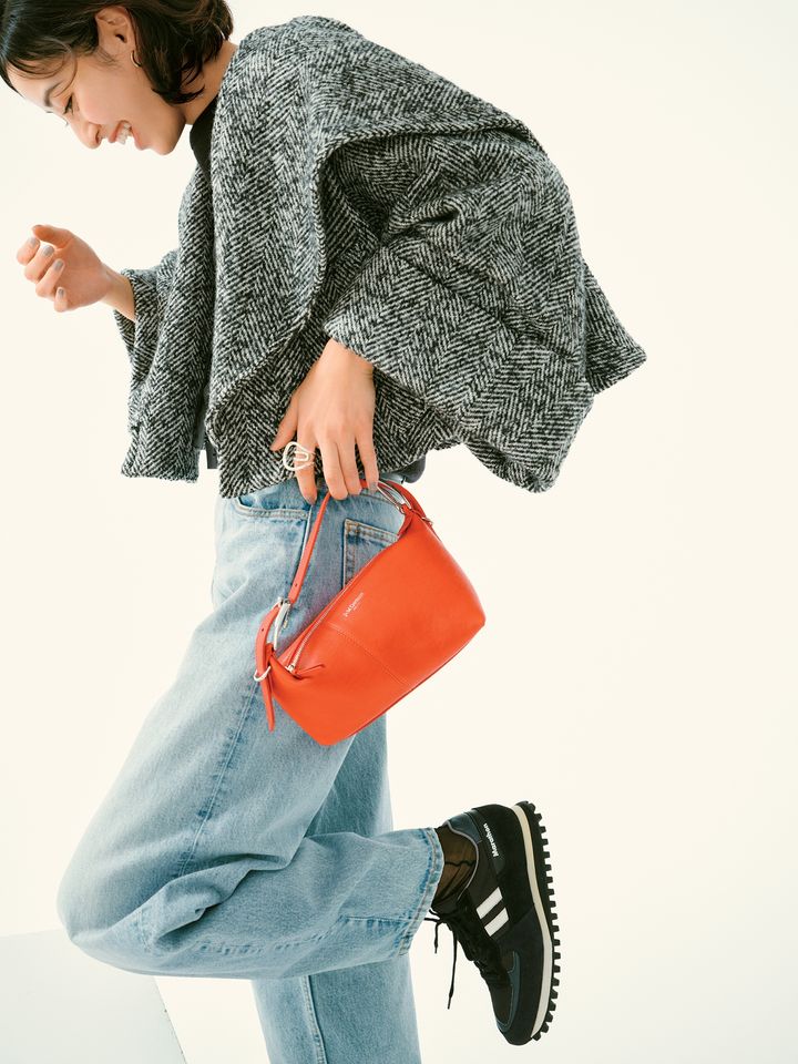 今季多く見かける黒スニーカーは、ローファー感覚でキレイめに履けます。グレーのラメ靴下を合わせると、より華やかさが出て、スニーカーカジュアルが街仕様に。黒パンツとスニーカーの間にグレーが覗くことで、足元に軽さが出るのも◎。靴下は靴下屋、スニーカーはプーマ、パンツはクロ、ニットはトミー ヒルフィガー、ジャケットはHER.、バッグはADD CULUMNのもの。