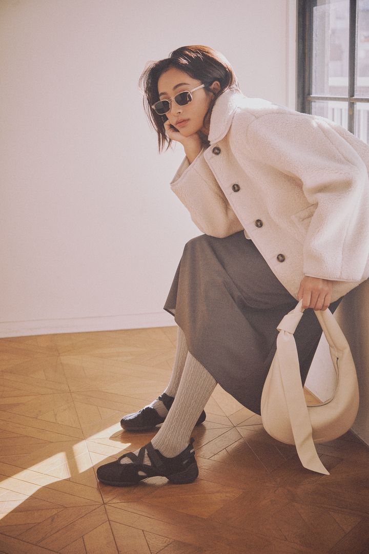 バレエコア流行りの今、ぜひやってみたいトレンカ・靴下・バレエシューズの組み合わせ。レギンスよりも華やかで凝ったオシャレに見えるので、トップスはラフなデザインで十分です。バレエシューズはダイアナ、トレンカと靴下はスタイリスト私物、スウェットはベルベルジン、バッグはジャンにキアリーニのもの。