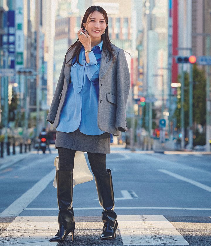 大人のミニスカコーデは品格配色グレー×緻密な丈感バランスが肝。以前の女子会は映えな甘服以外ありえなかったけど今はトレンドが最優先。今年はミニスカートとロングブーツが推しアイテムで女子会の新定番になりそう。
