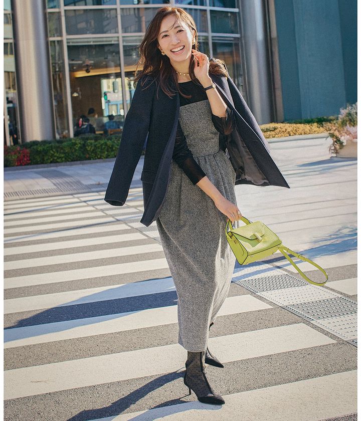 着るだけでオシャレをしていると実感できるワンピースでお仕事映えする甘さもプラス。オシャレの最先端を知っている人しかいない編集部には受注会で一目ぼれしたCygneのビスチェワンピースにきちんと感あるジャケットで出かけます。差し色にイエローのバッグ、ブーツからはTOKIDOKIのフリルソックスをのぞかせ自分らしいオシャレも満喫中。ライターになりオシャレの幅も広がりこれからの自分の進化が楽しみ。