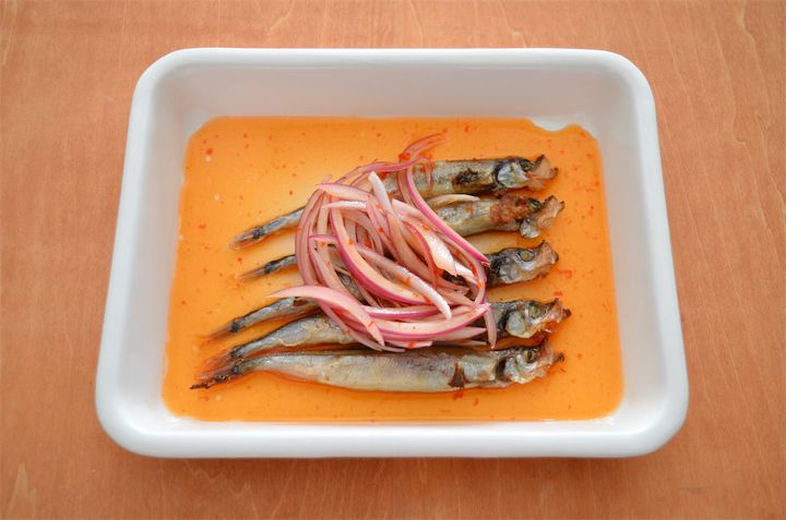 4.バットにししゃもを取り出し、熱いうちに2をかけて味をなじませる。