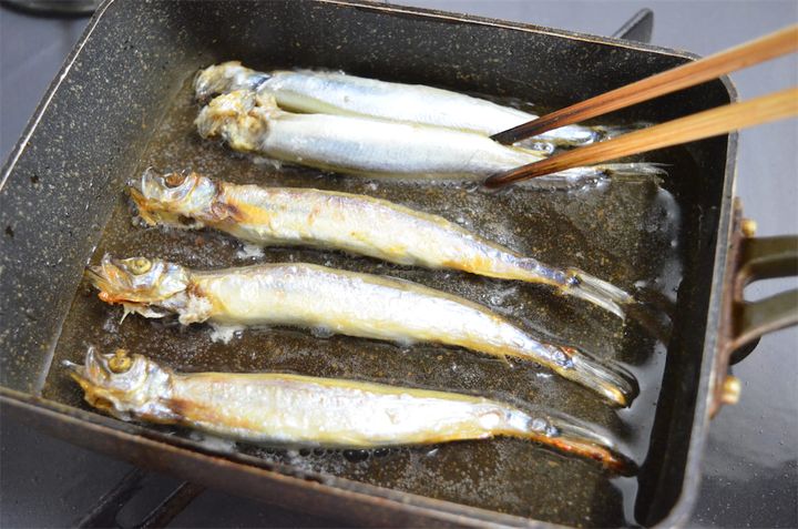 3.ししゃもに薄力粉を振り、余分な粉を落とす。フライパンにサラダ油を中火で熱し、ししゃもを並べ入れる。焼き色が付いたら裏返して、同様に焼く。