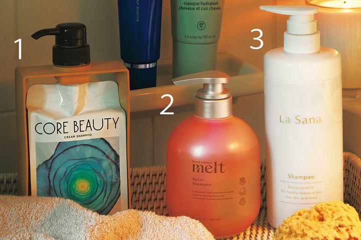 頭皮に優しくなじみもいいアミノ酸系シャンプー。すすぎ残しが肌への刺激にならないように、洗い流しをいつもよりも丁寧に。頭皮が乾燥している人はクリームシャンプーも。