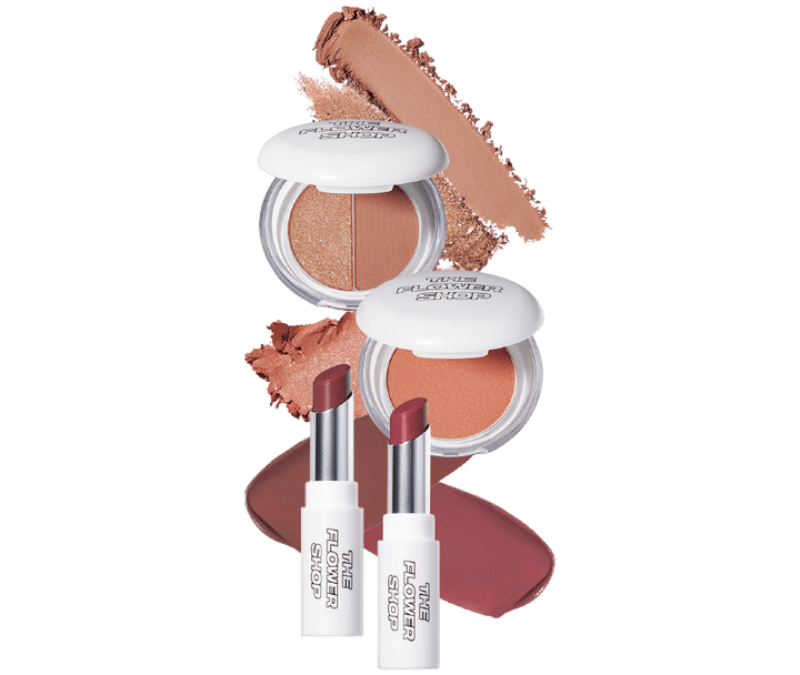 上から:ほんのり赤みを感じるマットなベージュに、ブルーラメが輝くシアーなブラウンのアイシャドウがコンビに。ザ・フラワーショップ アレンジメントシャドウ ミスティックアンバー¥2,420、オイルリッチなテクスチャーで、ピタッと頰に密着。頰に潤みのあるツヤがキラリ。同 グロウチーク シダローズ ¥2,420、鮮やかな発色でロングラスティングを実現。同 ペタルルージュ ブラウンローズ、コスモスルビー 各¥2,420(全てmsh)