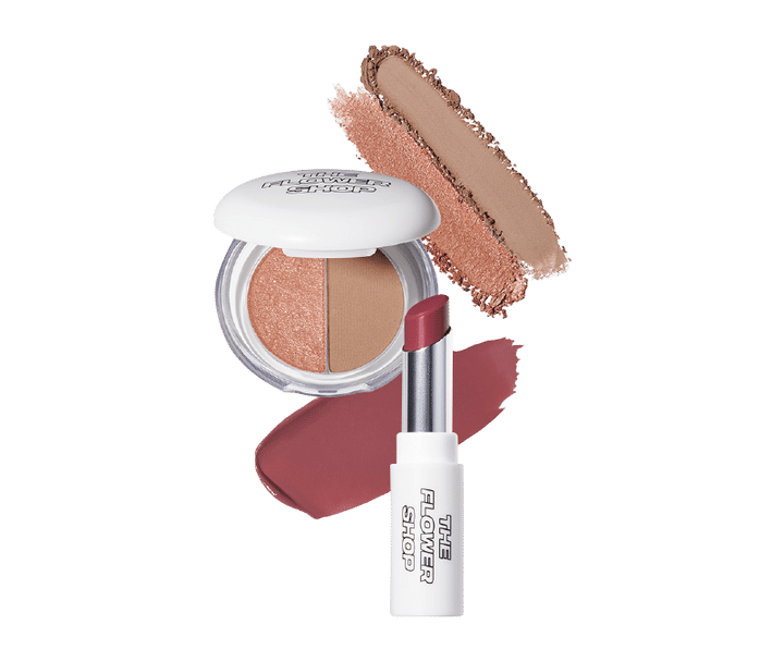 上から:粉とびのない繊細なパウダーがピタッと密着。大人のまぶたに嬉しい処方で、重ねるごとに奥行きのある発色が可能。ザ・フラワーショップ アレンジメントシャドウ ロマンティックシダー¥2,420、唇にふれた瞬間にとろけてピタッと密着する官能質感。肌を明るく見せるローズピンク。同 ペタルルージュ コスモスルビー¥2,420(共にmsh)