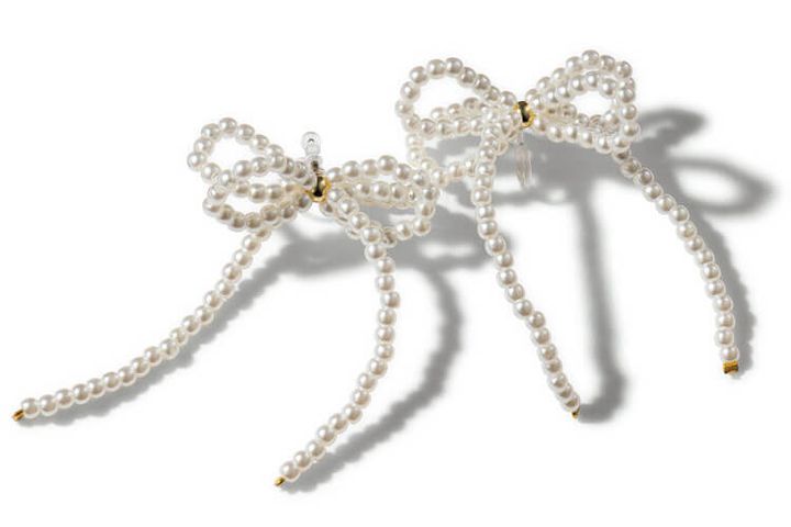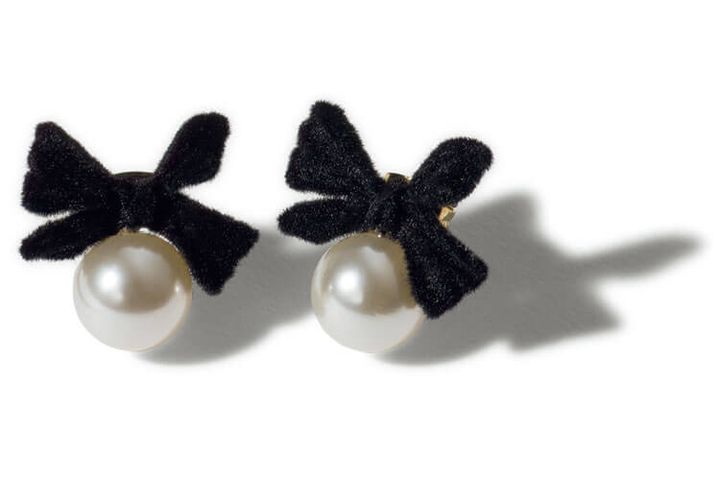 小粒パールでリボンをかたどった大人可愛い見た目。ベーシックコーデに甘さを加えたいときにプラスして♡